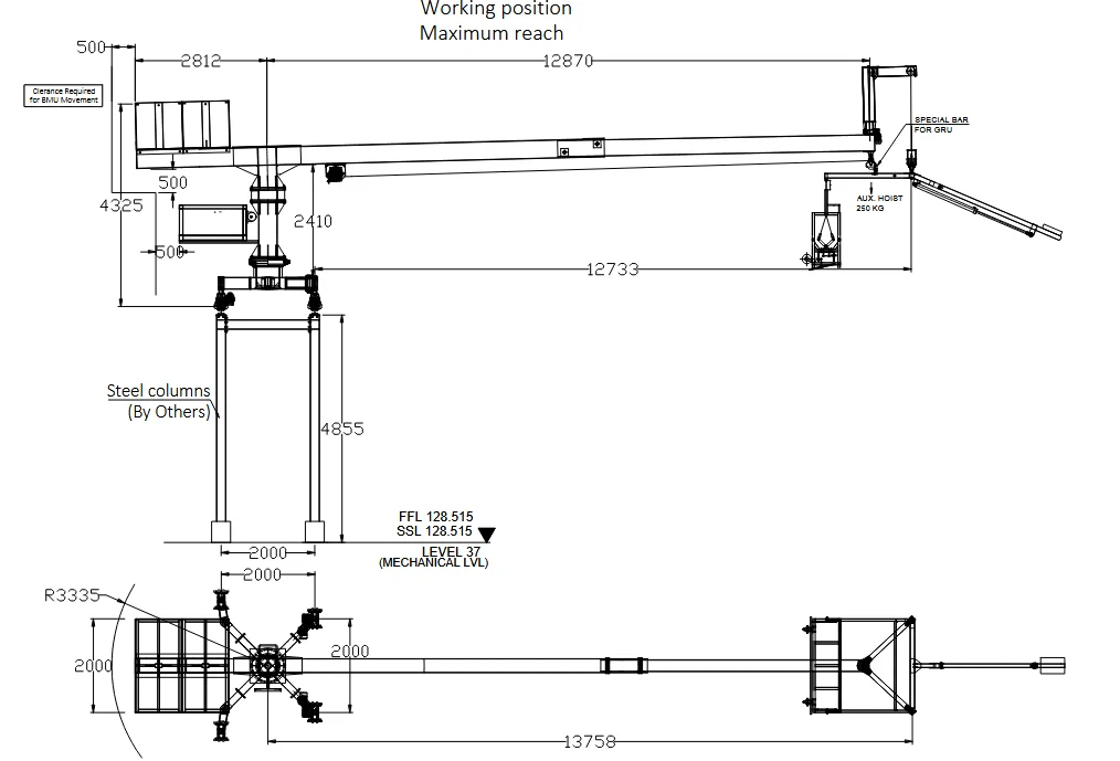 The BMU is a T-machine running on an elevated track, featuring a pantographic cradle of 1.8m reach and it has a GRU capacity of 250 kg. The tracks for the machine are installed on steel upstands and clear a high parapet wall of about 6m from the slab. This configuration allows both 117m tall towers to be effectively served. This 30 ton BMU has been serving the
