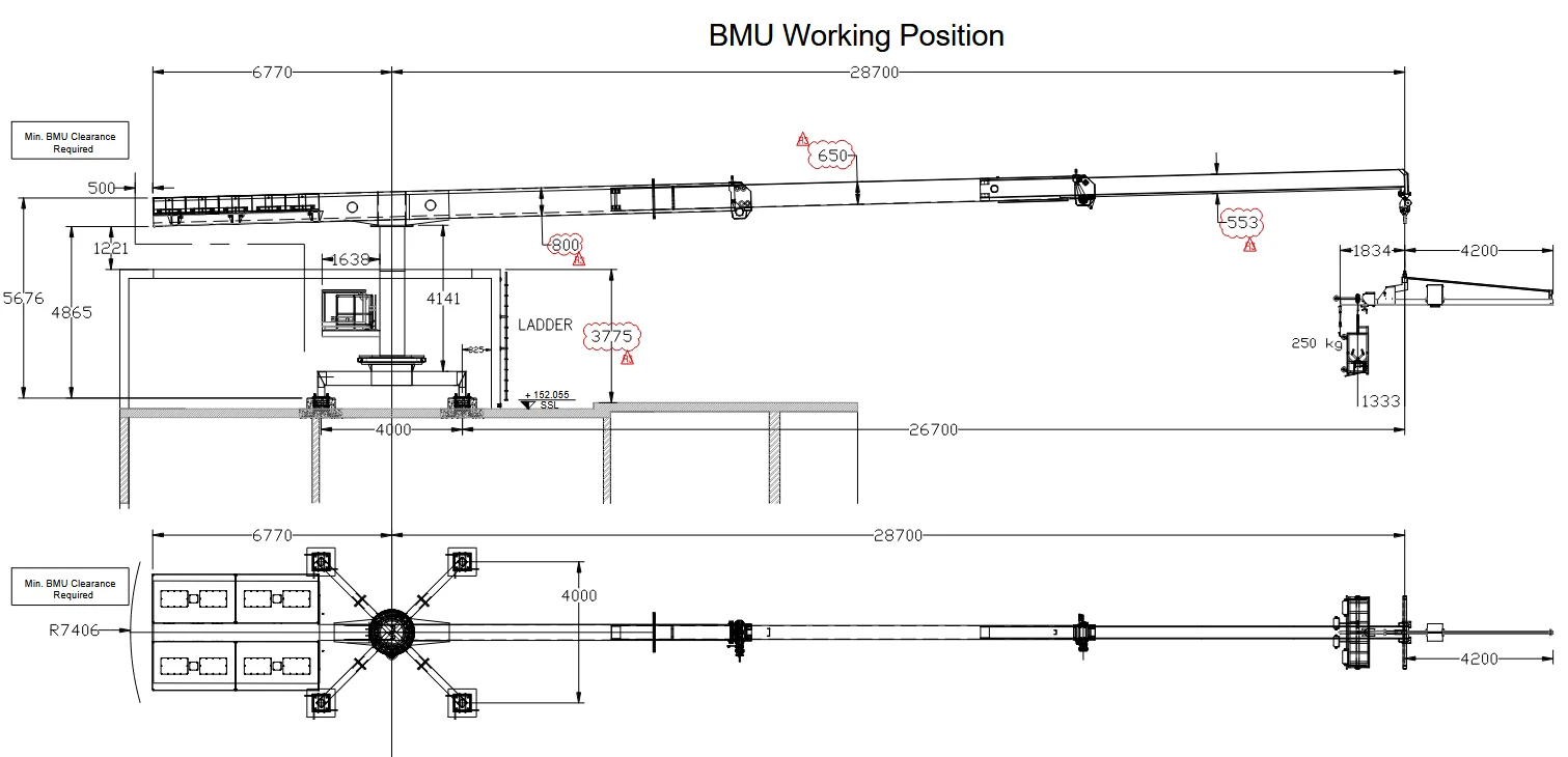 The BMU in this project is a T-machine running on an elevated track, featuring a 4m telescopic cradle and it has a GRU capacity of 250 kg. The tracks for the machine are installed on steel upstands and clear a high parapet wall. The 29 m telescoping jib allows the machine to serve the whole building effectively. The machine weight is 30 tons and the working height is about 155m.