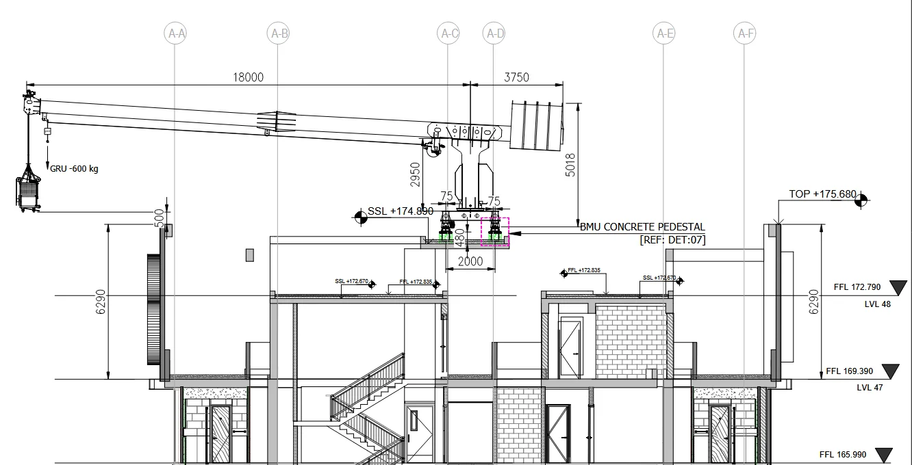 This is an extensive project with three towers served by a BMU each and the two connecting blocks between the towers being served by self-climbing cradles using davits. Each part of this project presented a unique challenge and the design of all the machines is customized to each individual tower. Tower A machine has an elevated track that was elevated by steel upstands and concrete pedestals. For Tower B and C, the track is completely on steel upstands. Another difference is that in Tower A, a standard 2 man cradle gets the job done whereas in Towers B and C, the presence of recesses meant that pantographic cradles had to be used. The machine weighs 40 Tons and has a GRU capacity of 600kg. The working height of the machine is almost 180m.