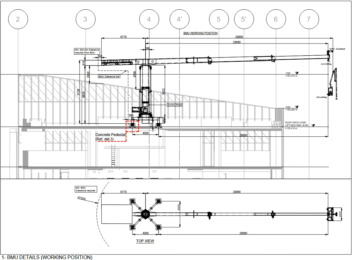 The BMU is a T-machine running on an double rail track, featuring a 2m hydraulic pantographic cradle and it has a GRU capacity of 250 kg. The tracks for the machine are installed on concrete pedestals. The Mast is telescopic to hide the machine in parking so that all the elevations of the building look exactly as the architect envisioned it. In this project there was a challenge of deep recesses where cradle and especially GRU couldn’t reach. To address this issue, ASE came up with a pulley system to all the GRU to be used even in the deepest recesses. There are also eye bolts installed in these deep recesses to allow abseilers to position themselves close to the façade in such a way that allows them to apply sealant for glass replacement. This 50 ton machine is successfully serving this project. One the top roof there is an area served by L brackets as it is too close to the BMU, abseilers clean that area of the façade. The machine itself runs at a working height of about 160m.